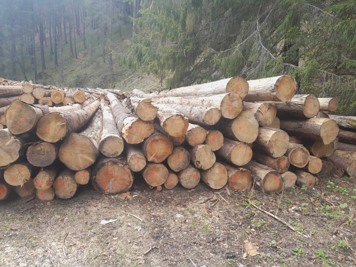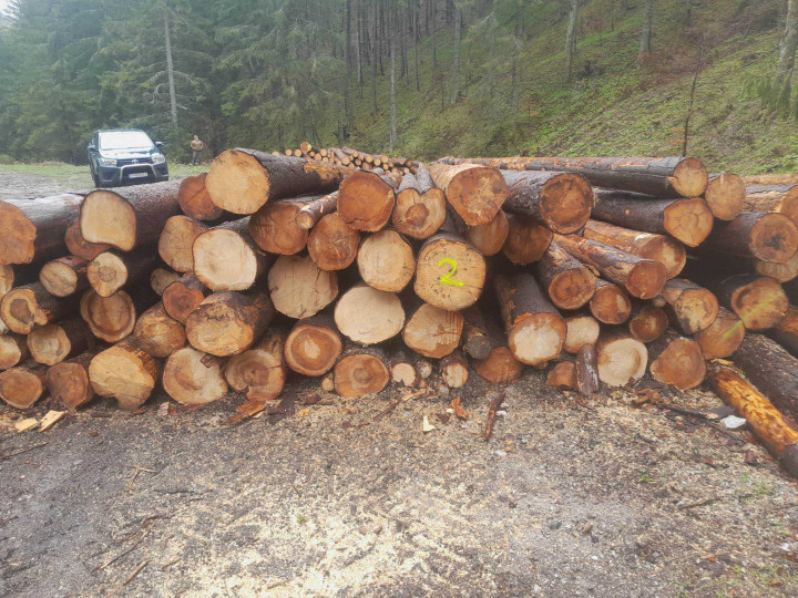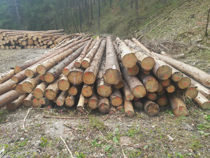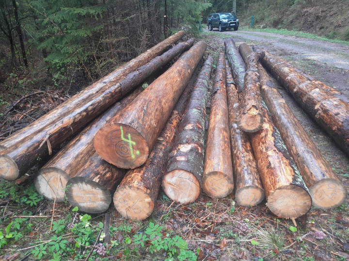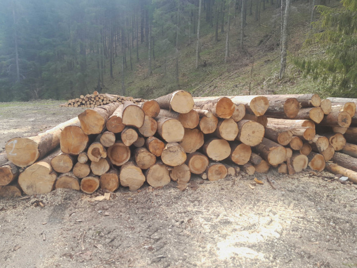 Surové kmene ihličnaté SM 150,66 m3, SC 5,86 m3, JH 0,25 m3. 75% suché, 25% surové, v odvozných dĺžkach. Drevo je uložené na pevných OM.